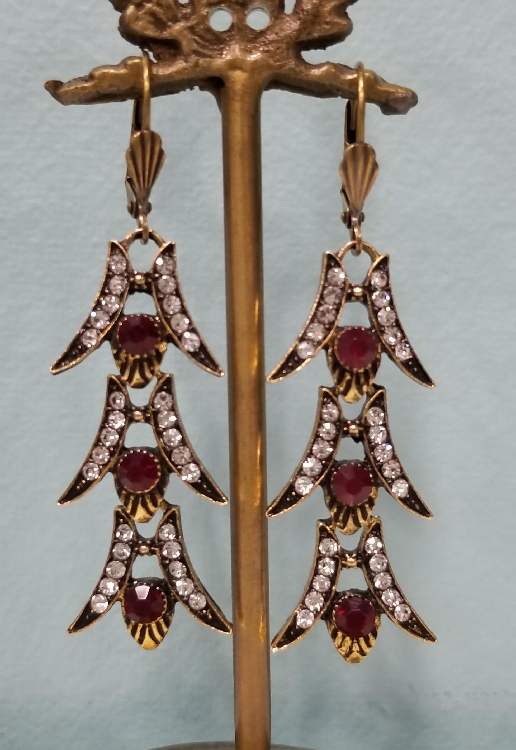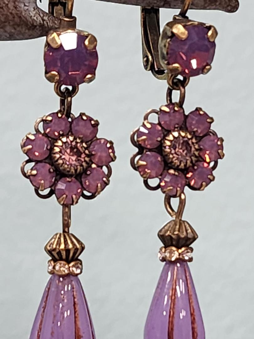 Pink Floral Vintage Style Antique Brass Drop Earrings