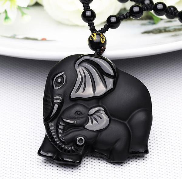 Mother and Baby Black Obsidian Elephant Necklace