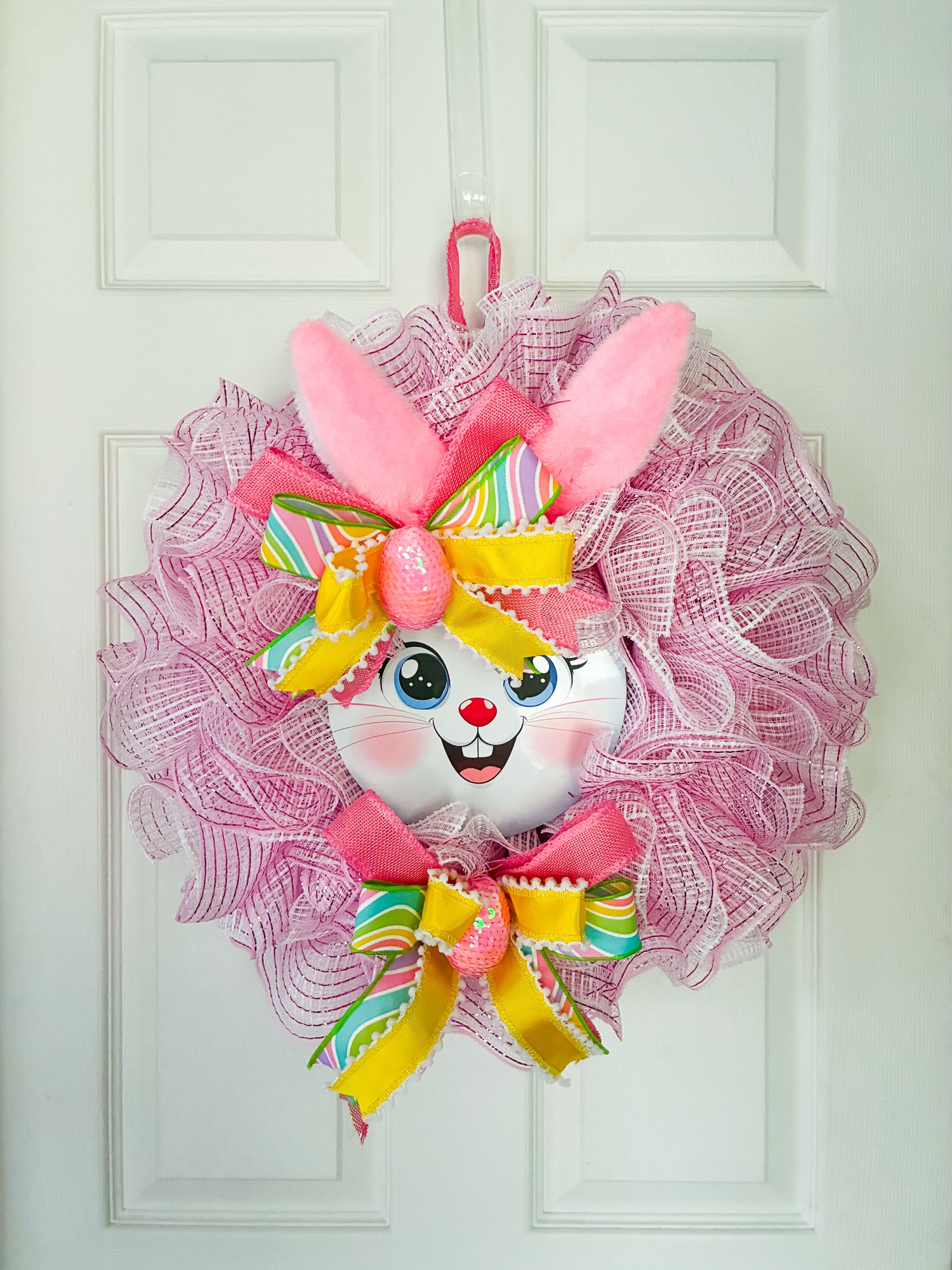 20″ Easter Bunny Face – Pink Fused with White Check Fabric Pancake Wreath