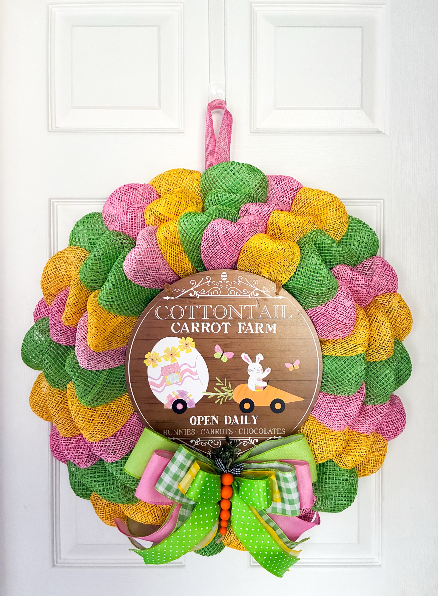 23″ Easter Cottontail Carrot Farm Pink-Green-Yellow Daisy Petal Poly Burlap Wreath