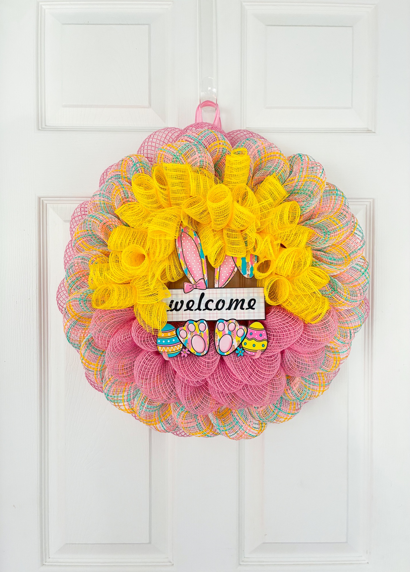18″ Welcome Easter Bunny Turquoise, Pink & Yellow Lollipop Petal & Tube Wreath
